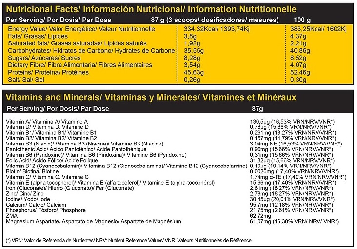 Ce ratio permet de prendre du poids en limitant considérablement la prise de gras, et notamment grâce à sa source d’hydrates de carbone Viggro [amidon hydrolysé] qui a un impact modéré sur l’insuline permettant d’atteindre un niveau stable de l’azote et de la glycémie. Cela est utile à la fois pour l’énergie et pour optimiser les processus de réparation des tissus de tissus endommagés après l’entraînement.